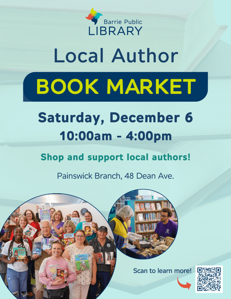 I’ve officially joined Barrie Library’s Local Author event, on December 6th at the Painswick Branch! Please stop by and check out amazing local talent, and come by my booth for a chat!